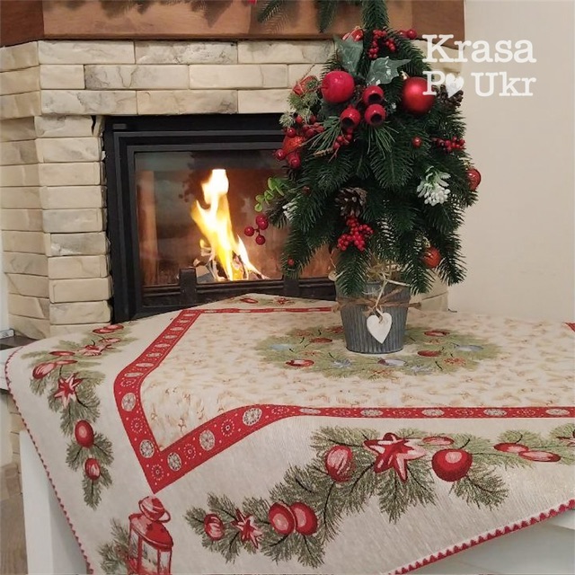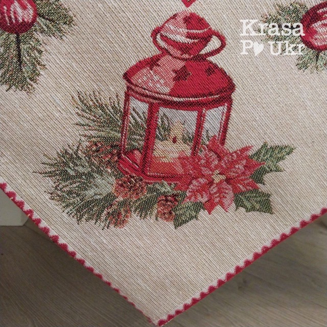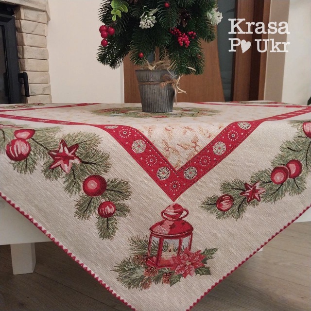 Тканина приємна на дотик і водночас практична — ідеально для повсякденного використання протягом усього зимового сезону. Теплий молочний фон і класична червона рамка створюють естетику традиційного Різдва, а декоративні елементи — ялинкові іграшки, гілочки хвої, ягідки та ліхтар — роблять скатертину по-справжньому нарядною та святковою.