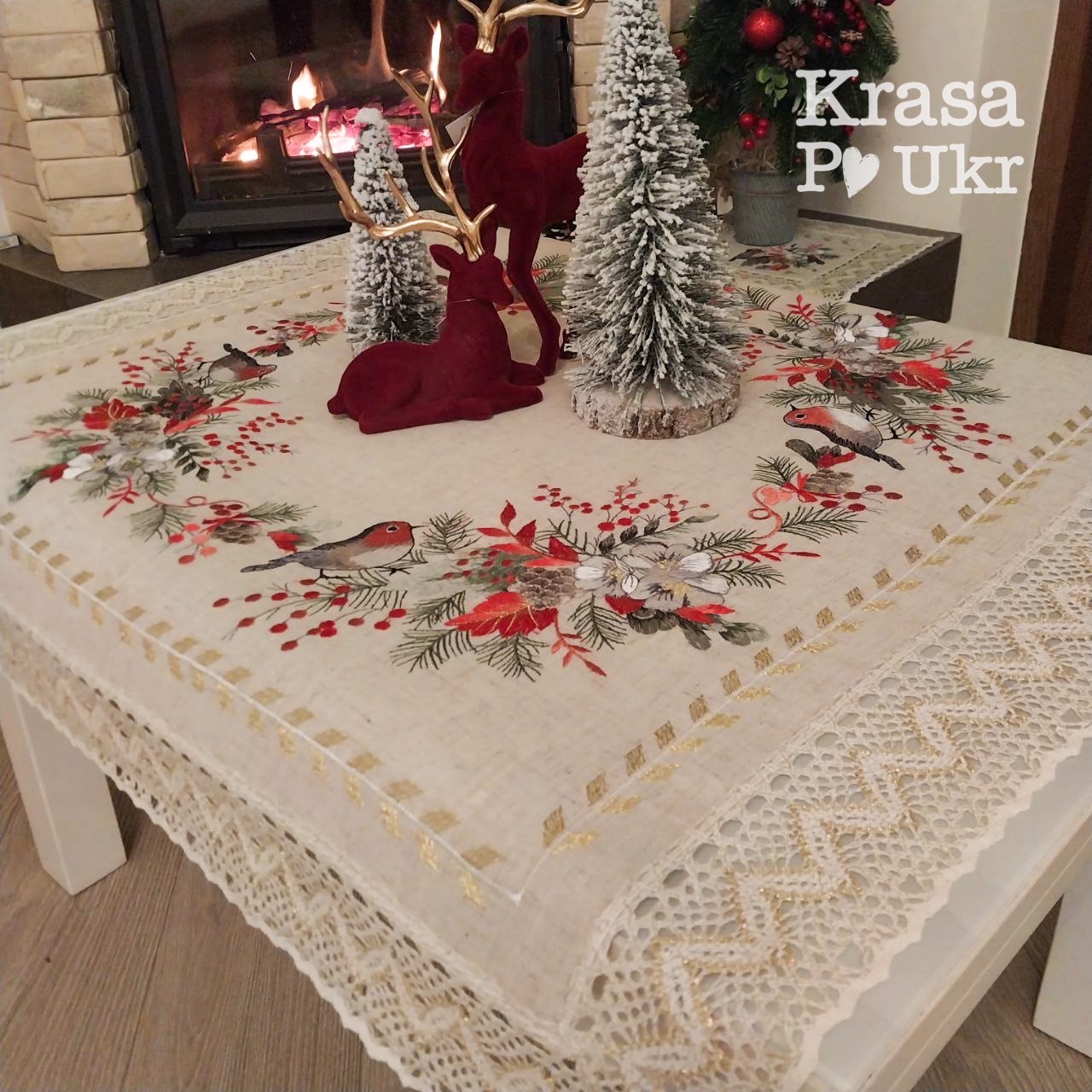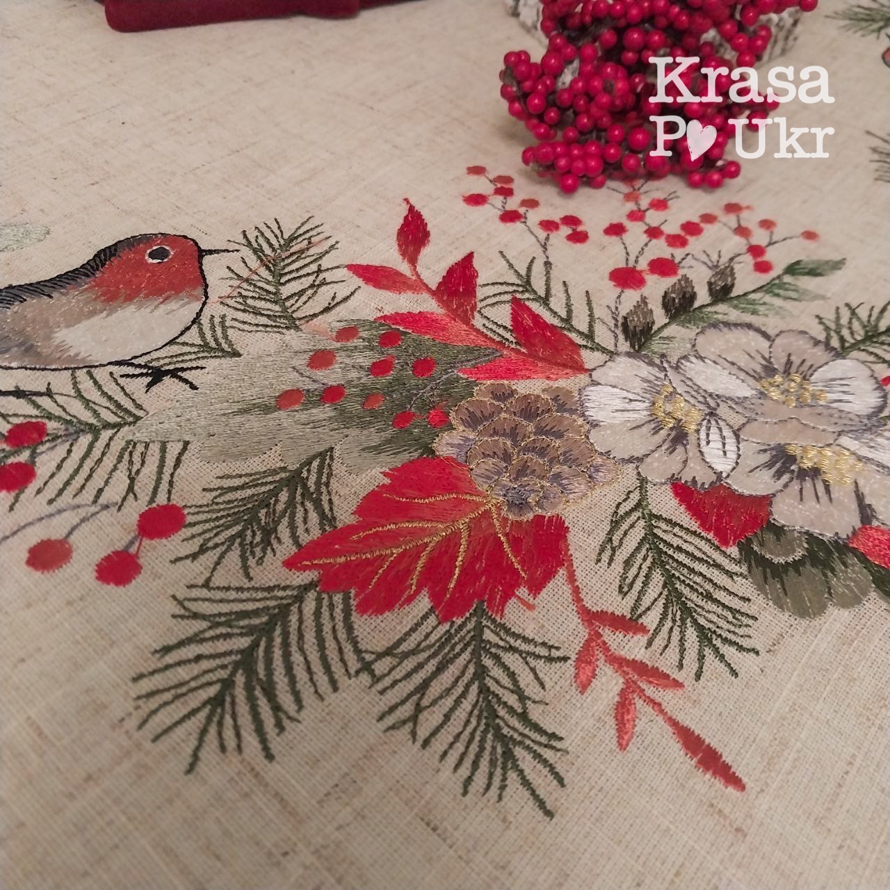 Основний акцент скатертини — тематична вишивка з зимовими композиціями, ягідними гілочками, хвоєю та снігурами. Птахи, які традиційно вважаються символом тепла серед зимових морозів, чудово підкреслюють атмосферу різдвяного затишку. Акуратні деталі вишивки, виконані у насичених червоних, зелених та світлих тонах, створюють відчуття ручної праці та додають виробу унікальності. Кожен фрагмент орнаменту виглядає ніби живописний різдвяний сюжет — природний, святковий та теплий.