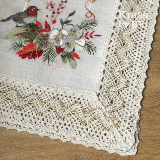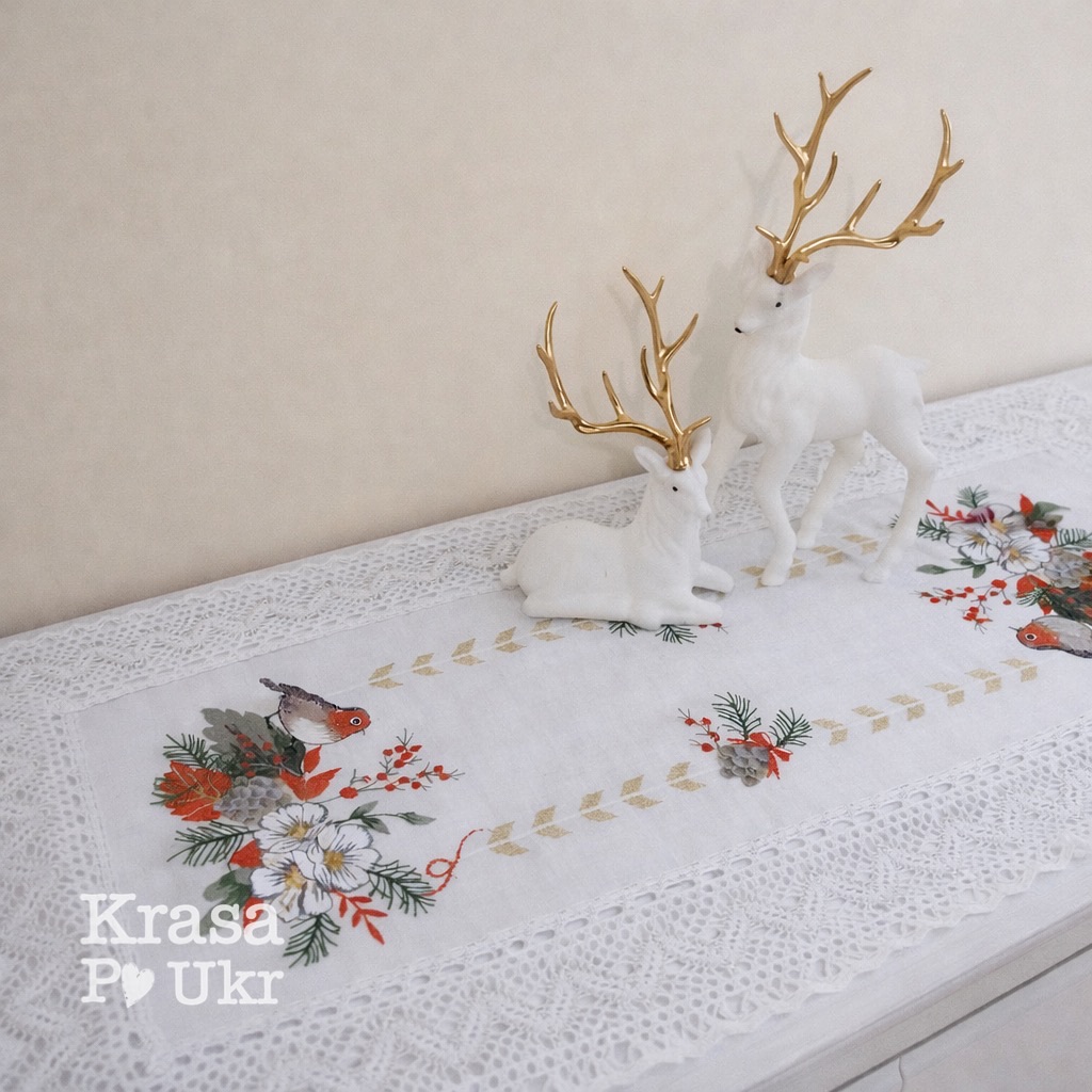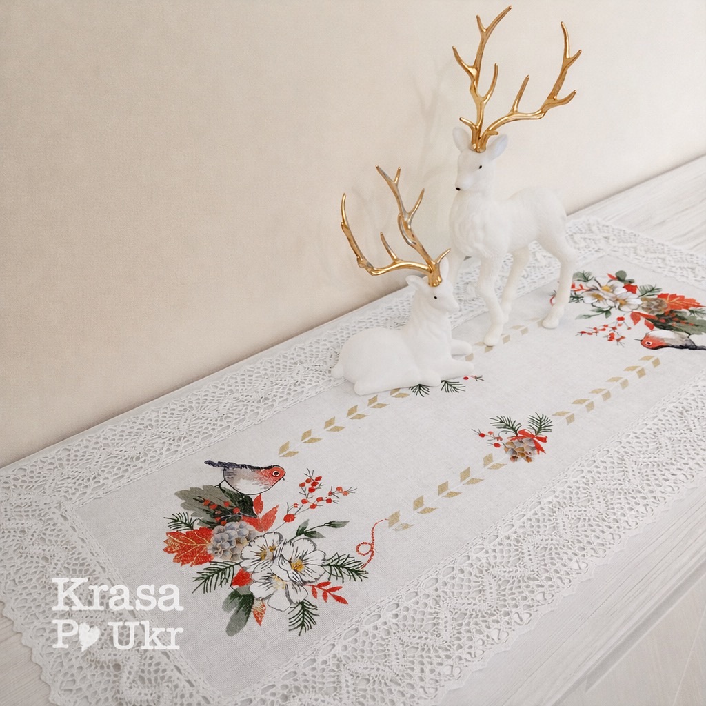 Вишита доріжка «Різдвяний снігур» з мереживом (біле з золотавою ниткою) 40*120 см – біла