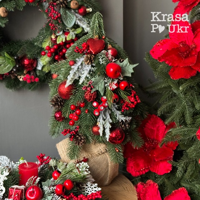 Лита зелена ялинка висотою 50 см із колекції «Різдвяна Класика» — стильний святковий акцент для дому. Декорована червоними ягодами, іграшками, шишками та зимовими елементами. Ідеальний варіант для столу, комоду чи різдвяної зони, створює теплу атмосферу Нового року.