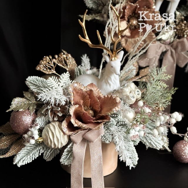 Композицію доповнюють великі магнолії в кольорі карамельне лате, шишки, декоративні ягоди, кульки у відтінках рожевого та шампань, гілочки з блиском і велюрові банти ручної роботи. Усе це формує багатошарову структуру, що виглядає надзвичайно ефектно при денному освітленні або в світлі гірлянд.