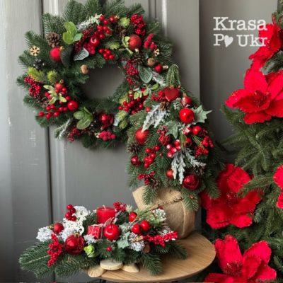 Кольорова палітра вінка витримана у класичних бордово-червоних тонах із теплими натуральними відтінками. Це поєднання створює атмосферу домашнього затишку, тепла та гармонії, яку так хочеться відчути у різдвяні свята. Декор виглядає об’ємно, святково, але водночас дуже природно — без надмірного блиску, зі смаком і гармонією.