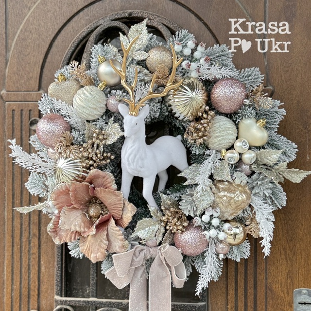 Основа виконана з литих, засніжених гілочок хвої, що надає вінку ефект засніжених гілочок. Пудрово-рожеві, карамельні та шампань-відтінки куль створюють теплу, м’яку і дуже елегантну атмосферу. У декорі використані золотисті елементи, глітерні гілочки, великі блискучі кулі та святкові акценти у пастельній гамі.