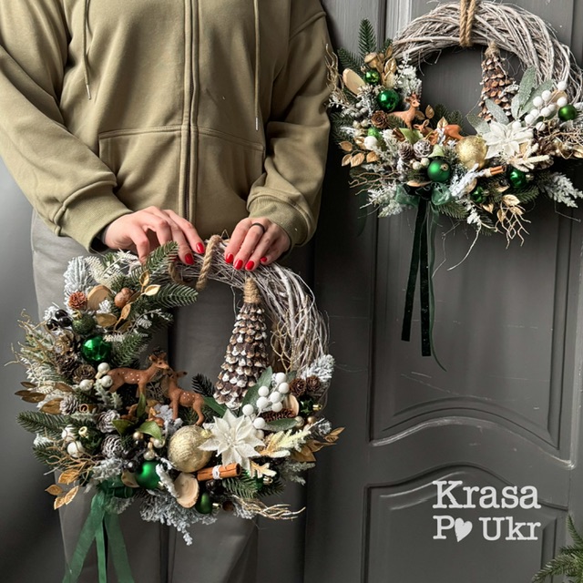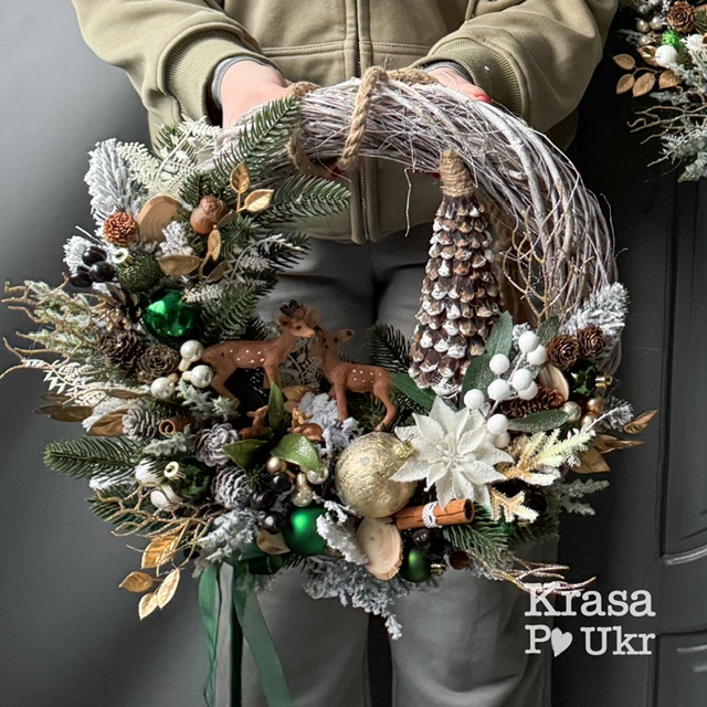 Центральною особливістю є ялинка ручної роботи, виконана зі шкарлупи шишок — кожна деталь ретельно продумана, аби створити ефект натуральної текстури та об’ємності. Родзинкою композиції є сім’я чарівних керамічних оленят — мама, тато і двоє малюків, що символізують домашній затишок, любов і єдність. Саме вони додають вінку казковості та роблять його особливим серед інших.