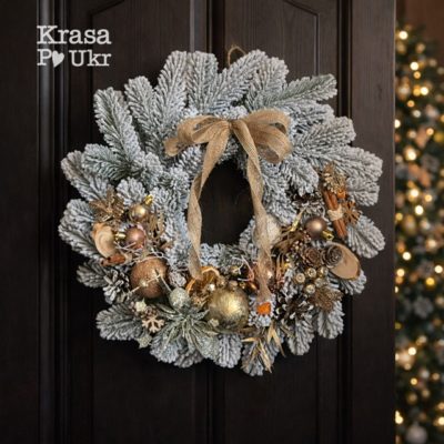 Вінок прикрашений декоративними ягодами, шишками, елементами хвої та дрібними святковими деталями у смарагдовій і золотистій гамі. Таке поєднання створює відчуття розкоші, але без надмірності — гармонійно, стильно й святково.