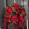 Вінок на двері «Різдвяна класика» — дизайн “королівський червоний” з оксамитовим оленем та кулями (48 см)