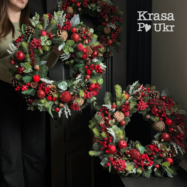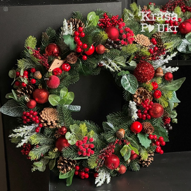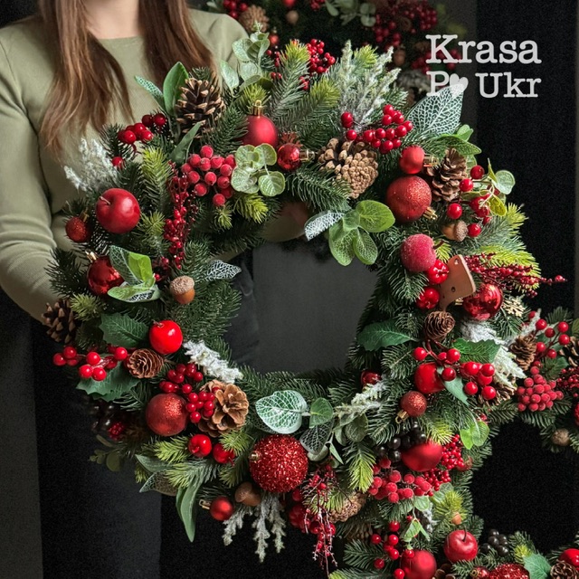 Декор поєднує найкраще з класичних зимових мотивів: червоні кульки, яблука, калину, самшит, подаруночки, шишки й безліч дрібних декоративних деталей. Усе продумано до дрібниць — вінок виглядає багатим, але водночас гармонійним і природним.