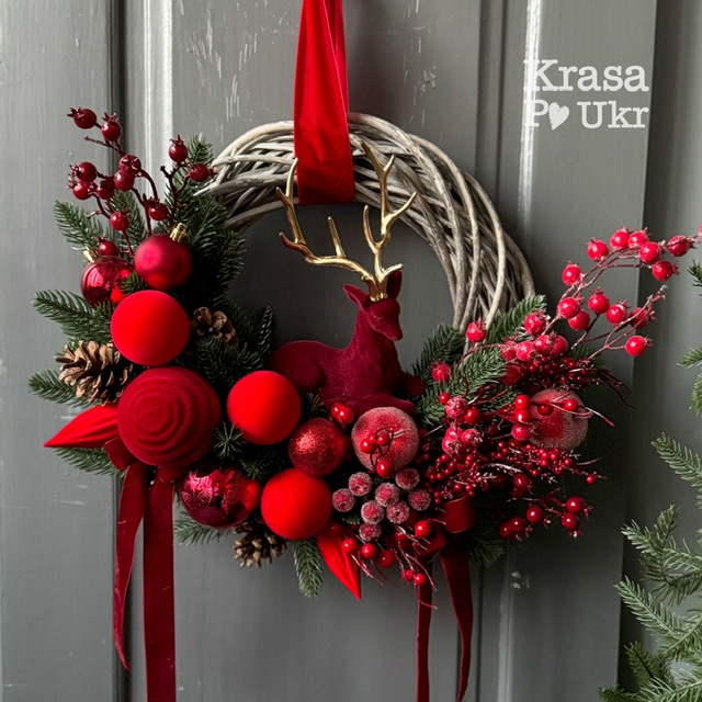 Основою виробу є міцна лоза, обплетена преміум литою хвоєю, що виглядає надзвичайно натурально. Її глибокий зелений відтінок чудово поєднується з бордовими, червоними та золотими елементами декору. Головний акцент — оксамитовий бордовий олень із золотими рогами, який надає вінку елегантності та символізує різдвяний дух і добробут.