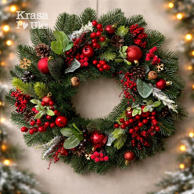 Декор виконано у класичному різдвяному поєднанні кольорів — червоного та зеленого. Яскраві червоні кульки, шишки, гілочки з ягодами та інші святкові елементи створюють відчуття справжнього свята. Вінок випромінює тепло, гармонію та водночас виглядає стильно й дорого.
