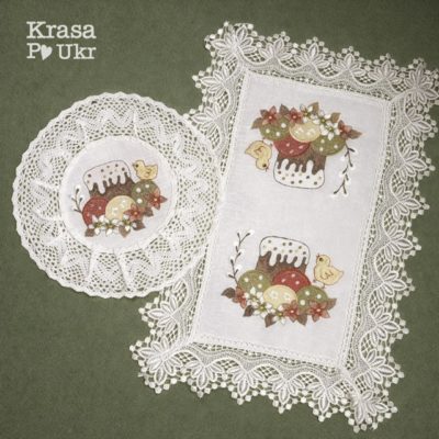 Комплект атласних серветок “корзинка з пудровими писанками” (44*30 см і 30 см)