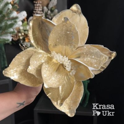 Новорічна магнолія 20 см з глітером на пелюстках, карамельне лате
