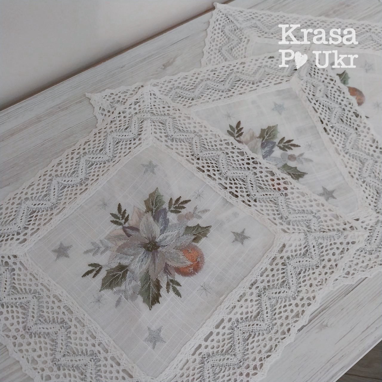 #114 Скатертина на стіл та серветки “Різдвяний снігур” 110*160 см, 135*180 см,150*220 см — льон із мереживом